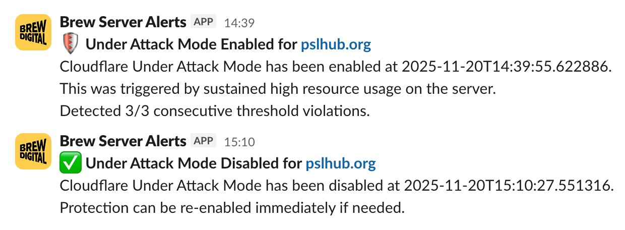 We can see the activity through Slack webhook integration, which shows when thresholds are breached and when the attack is over. Whether the spike lasts 10 minutes or 10 hours, the system reacts immediately without human intervention.